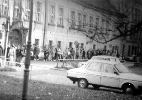 Proudy studentů jdou 17.11.1989 ulicí Ke Karlovu kolem psychiatrické kliniky směrem ke schodům na Albertov