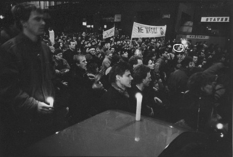Narodni trida 17.11.1989 večer, ještě před zásahem. To jsem už nefotil já, ale naopak někdo vyfotil mě (to je ta o 20 let mladší bíle zakroužkovaná ještě naivní hlava :-)) 5-6 řad přede mnou je ten slavný kordon příslušníků Pohotovostního pluku.